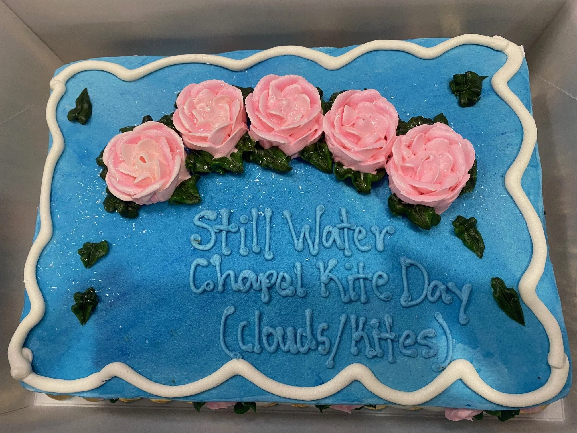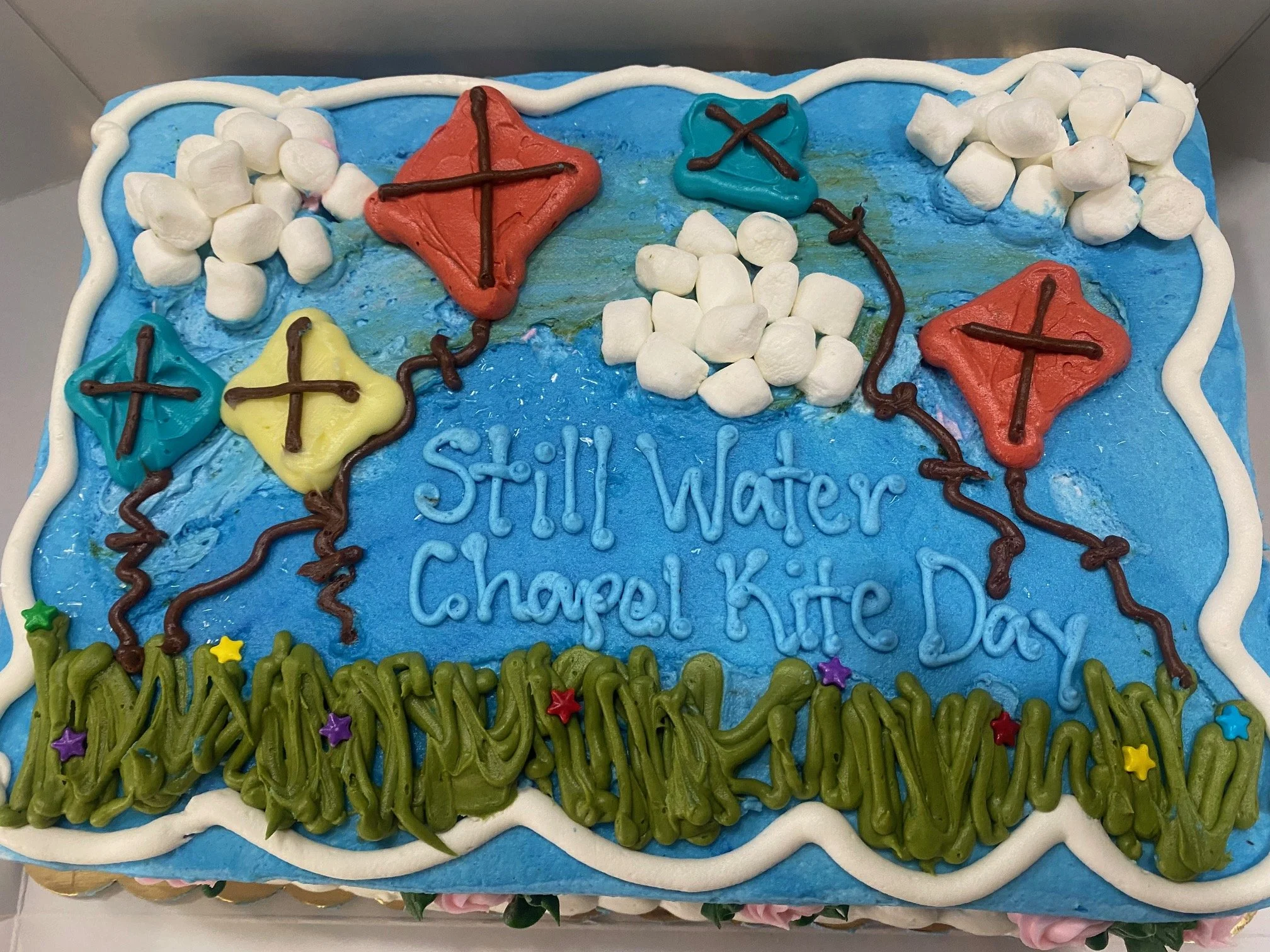 The first picture was a special cake my sister ordered for kite day at my dad‘s church. Her special instructions were in parentheses. And the second picture is how she fixed it at home.